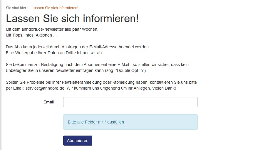 Im anndora Newsletter erhältst du in regelmäßigen Abständen viele Infos und Tipps rund um das Sortiment des Online-Handels, allerdings kannst du dich auch immer weuder über Aktionen und anndora Gutscheincodes freuen! Dazu brauchst du nur ganz einfach den kostenlosen Newsletter zu abonnieren. Das funktioniert ganz einfach auf der Startseite von anndora im unteren Bereich.