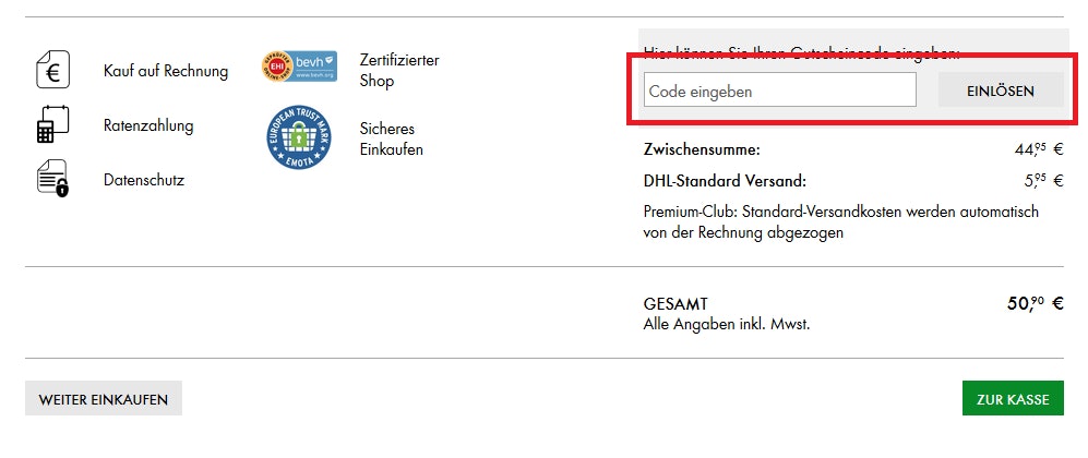 - Trage im Warenkorb deinen Rabattcode ein und bestätige die Eingabe, damit der Rabatt sofort gutgeschrieben wird.