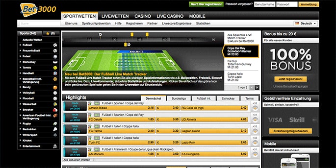 Das Prinzip von Bet3000 ist denkbar einfach. Ihr meldet euch an, ladet euer Konto auf und könnt sofort wetten. Zuerst registriert ihr euch und gebt eure persönlichen Daten an. Um euer Wettkonto aufzufüllen, habt ihr mehrere Zahlungsmöglichkeiten: Kreditkarte, Banküberweisung, Paysafecard, Ukash, Moneybookers und Sofort Banking. Besonders als Neukunde könnt ihr dabei vom Bet3000 Bonus profitieren. Ab einem bestimmten Betrag, den ihr einzahlt, bekommt ihr eine entsprechende Gutschrift. Das verschafft euch einen zusätzlichen Anreiz zum Wetten und ein Polster bei euren ersten Wettversuchen.
