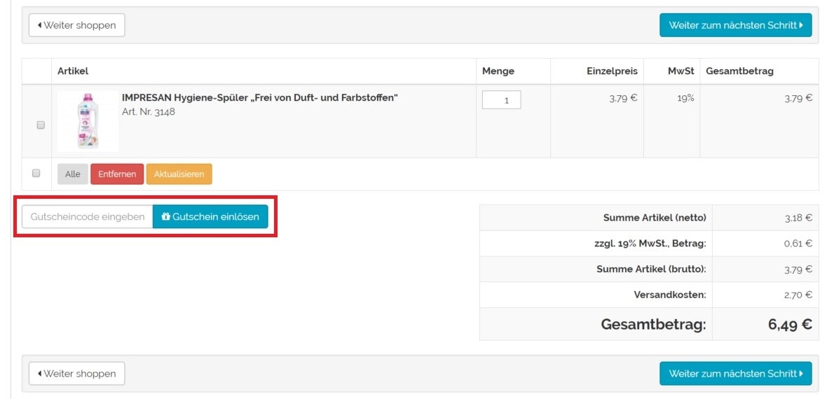 - Gebe den Rabattcode in das Feld im Warenkorb ein und bestätige