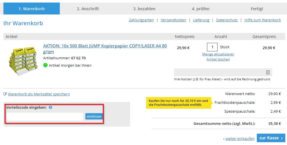 - Im Bereich des virtuellen Warenkorbs gibst du den büroplus Vorteilscode vollständig in das Gutscheinfeld ein.