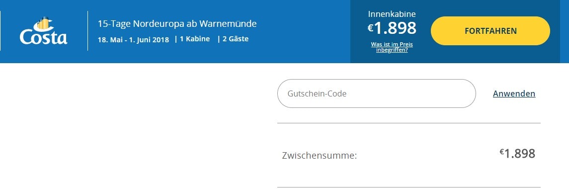 - Im nächsten Schritt hast du nun die Chance, deinen Gutscheincode für das Costa Kreuzfahrten Reiseportal einzutippen und so an deine Rabatte zu kommen.