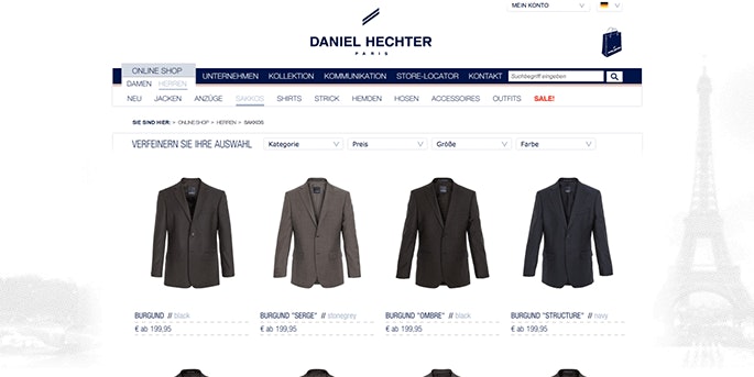 Im Shop Daniel Hechter kannst du dir ein komplett neues Outfit zusammenstellen. In der Kategorie Outfits findest du dazu Kombinationsmöglichkeit von aufeinander abgestimmten Kleidungsstücken von Daniel Hechter – vom Business-Outfit bis hin zum Casual-Outfit bestehend aus gemütlichem Strickpulli und Jeans. Auch die Männermode im Onlineshop von Daniel Hechter besticht durch edle Materialien und elegante Sportivität. Die Anzüge und Pullover aus feinster Merinowolle oder Schurwolle sind stilvolle Begleiter im Beruf und eignen sich für besondere Anlässe. Die passenden Accessoires für dein neues Outfit findest du übrigens auch im Daniel Hechter Online Shop. Der Shop präsentiert dir außerdem eine Übersicht der neusten Kollektion. Und wenn du einen Daniel Hechter Händler in deiner Nähe suchst, hilft dir der Store-Locator, den du im Daniel Hechter Onlineshops findest.