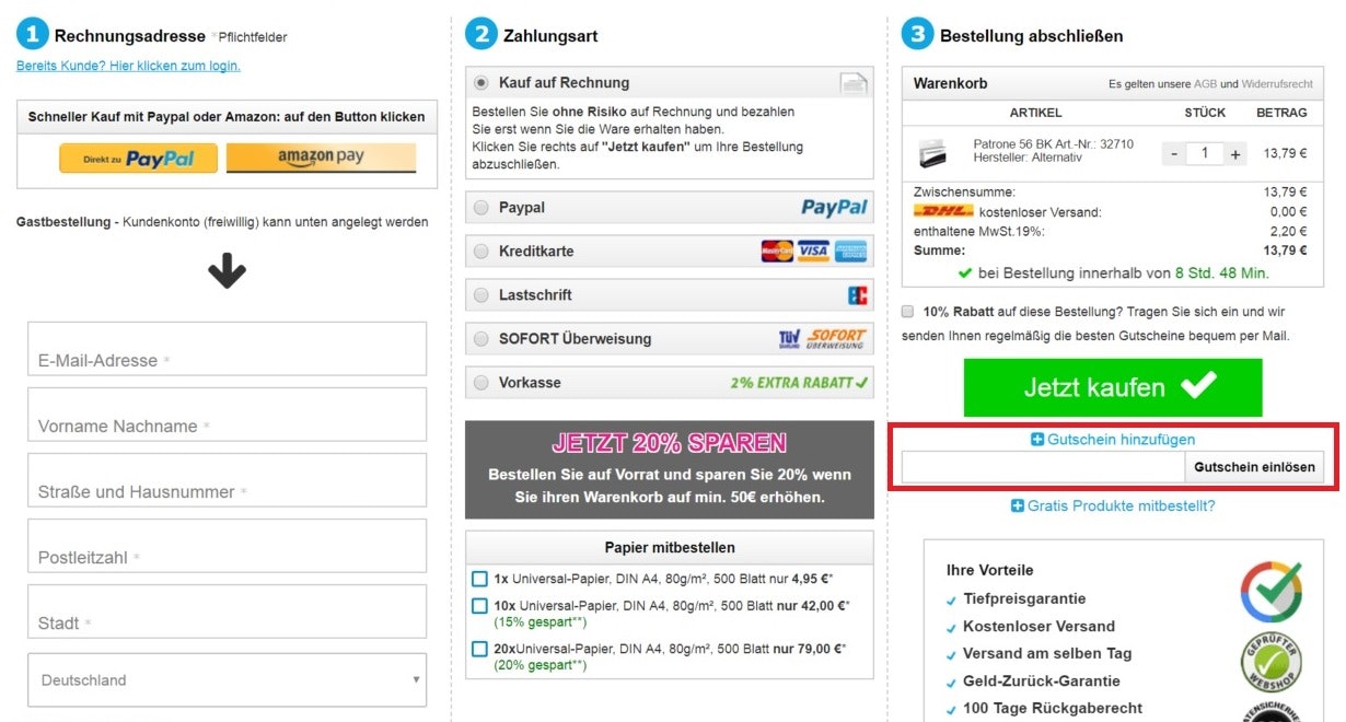 Am einfachsten ist es, wenn du den Druckerpatronen Sparcode in das Feld kopierst. Achte dabei darauf, dass du alle Zeichen des Codes kopierst. Tippst du den Code manuell ein, beachte auch die Groß- und Kleinbuchstaben. Unterläuft dir ein Tippfehler, kannst du den Rabattcode auch nicht einlösen.