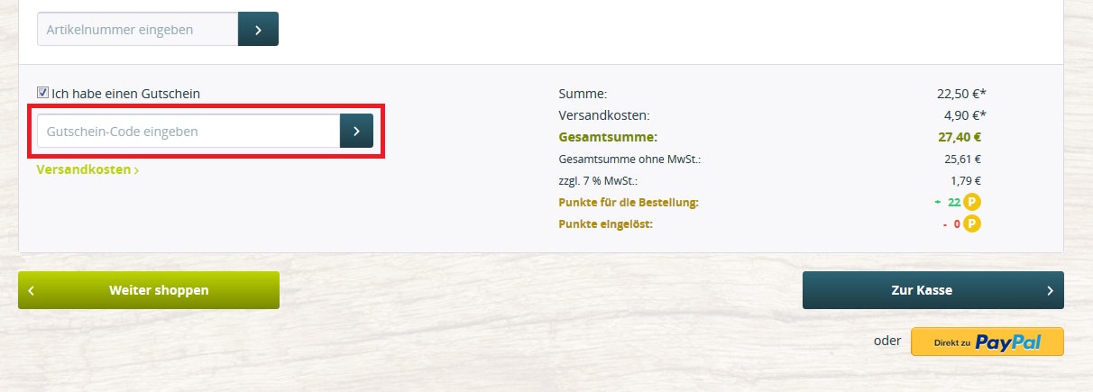- Im Einkaufswagen kannst du nun deinen Rabattcode eingeben und bestätigen, damit du den Rabatt erhältst.