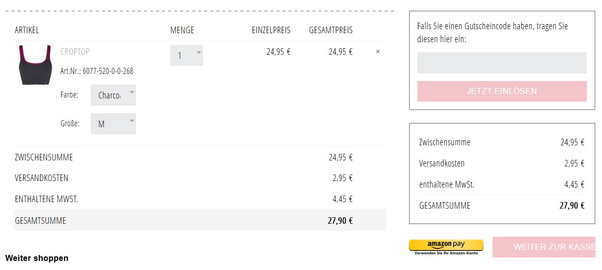 - Im Warenkorb kannst du deine Bestellung überprüfen – hier solltest du dich nochmal vergewissern, dass du auch deinen Rabattcode eingelöst hast!