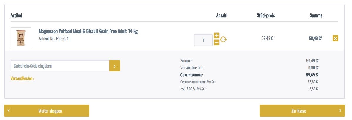 - Im Warenkorb kannst du nun links unten direkt deinen Gutscheincode angeben, um so blitzschnell deine Rabatte für den Lucky-Pet Shop zu aktivieren.