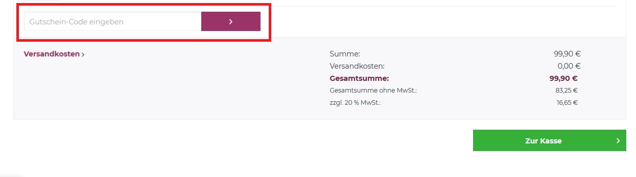 - Öffnest du den Warenkorb, findest du hier das Eingabefeld für deinen Gutscheincode, welchen du einträgst und bestätigst, um deinen Vorteil angerechnet zu bekommen.
