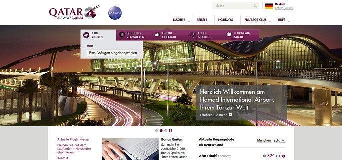 Entdecke die Welt ab Frankfurt, München und Berlin mit Qatar Airways zu über 130 Zielen. Nutze ein ausgezeichnetes Preis-Leistungsverhältnis und genieße über 1.000 Filme und TV, leckere Menüs, modernste Flugzeuge wie die Boeing 787 Dreamliner und natürlich höchsten Sitzkomfort. Erkunde die Welt mit beliebten Strecken wie dem Flug Frankfurt–Bangkok oder von Frankfurt nach Doha, der Heimatstadt von Qatar. Wenn du zum Mittleren Osten reisen möchtest, dann seien dir die Flüge Frankfurt–Dubai und Frankfurt–Muscat empfohlen. Wohin auch immer es gehen soll – mit Quatar Airways bereist du die Welt entspannt und ausgeruht. Erkunde auch die Business Class Specials mit ausgezeichnetem Service wie mehrgängigen 5 Sterne Menüs, einem besonderen Premium Terminal für Business Class Gäste und vielem mehr. All das findest du in den Business Class Specials.