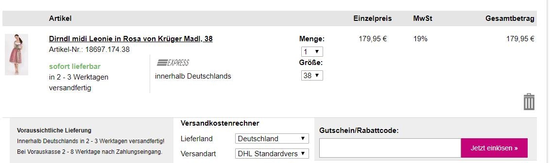 - Bevor du dich um die Bezahlung kümmerst, solltest du jetzt noch schnell deinen Trachtenhof Sparcoupon aktivieren, um deine Prozente mit dem Gesamtpreis deiner Bestellung zu verrechnen. Das Feld für deinen Rabattcode befindet sich unten rechts im Warenkorb.