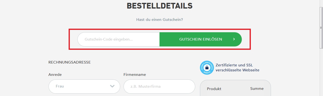 - Trage in dem nun erscheinenden Gutscheinfeld deinen ausgewählten Rabattcode ein und bestätige ihn, bevor du zu den Zahlungsoptionen fortfährst.