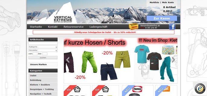 Auf verticalextreme.de gibt es folgende Kategorien: Outlet, Bekleidung, Klettern + Bouldern, Bergsteigen + Trekking, Navigation + Technik, Outdoor + Camping, Rucksäcke + Taschen, Schneeschuhe und Skitour. In der Kategorie „Bekleidung“ findest du Kletterbekleidung, Funktionsbekleidung und Merino Unterwäsche sowie Accessoires wie Mützen, Socken, Gamaschen, Handschuhe und Pflegemittel. Auf Grundlage einer 10-jährigen umfassenden Erfahrung findest du um Bereich „Klettern“ die beste am Markt verfügbare Kletterausrüstung. Vom Anfänger bis zum Profi, von günstig bis High-End – für jeden ist das richtige Equipment dabei. In der Kategorie „Outdoor“ gibt es eine breite Auswahl an Zelten, vom Leichtgewichtszelt bis zum Familienzelt sowie Schlafsäcken und Isomatten für alle Temperaturen von Sommer bis Winter. Und du findest dort die Outdoor-Küche, Gaskocher, Campingtöpfe und -geschirr sowie gefriergetrocknete Mahlzeiten.